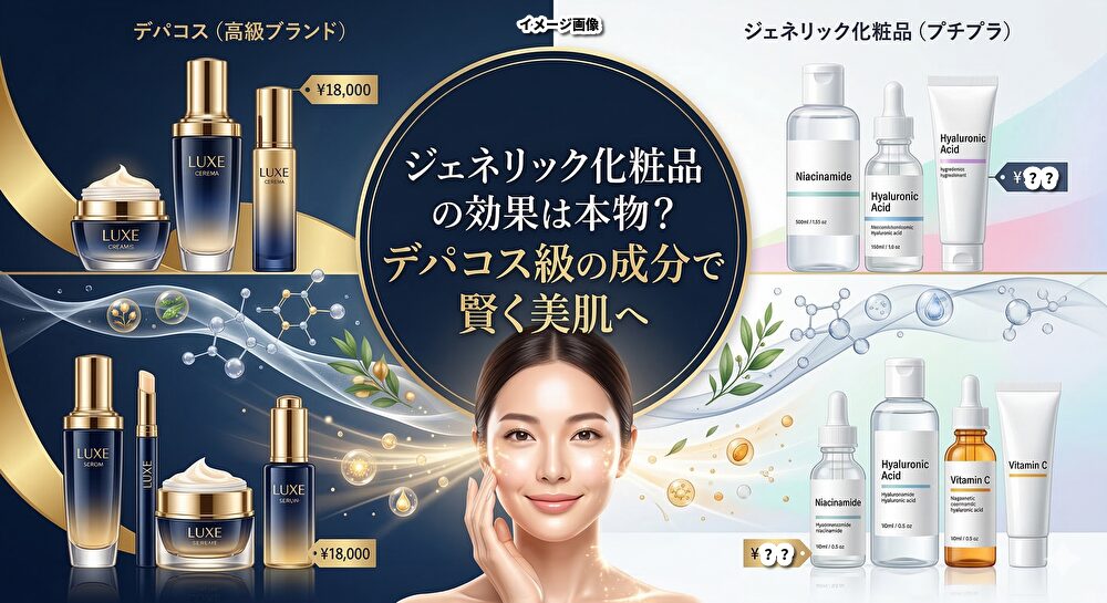毎月の化粧品代、家計の重い負担になっていませんか?「高いデパコスを使いたいけれど、継続するのが難しい」と悩む気持ち、よくわかります。この記事では、今話題の「ジェネリック化粧品」の驚くべき効果と、なぜ安くてもしっかり結果が出るのかを徹底解説します。賢く選ぶ目を持てば、予算を抑えながらワンランク上の美肌を手に入れることは十分に可能です。今日からあなたのスキンケア常識が変わる、コスパ最強の美容術をお伝えします。